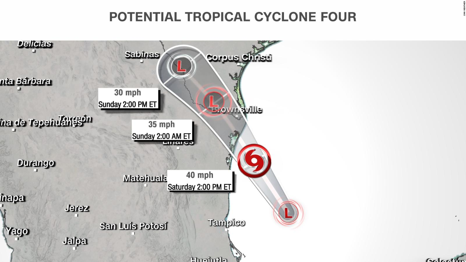 Una advertencia de tormenta tropical está vigente para la costa del Golfo de México desde Boca de Catán hacia el norte hasta la desembocadura del Río Grande, y en toda la costa baja de Texas, desde Port Mansfield hacia el sur hasta la desembocadura del Río Grande.