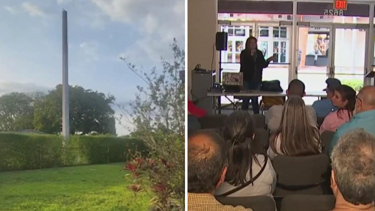 Son antenas de señal de celular que utilizan la tecnología 5G. La noche de este martes, residentes de Kendall se reunieron con políticos locales para manifestar sus opiniones y quejas sobre este tema. Muchos preocupados por una advertencia que dice que: “podría causar cáncer y/o defectos de congénito u otros daños reproductivos”.