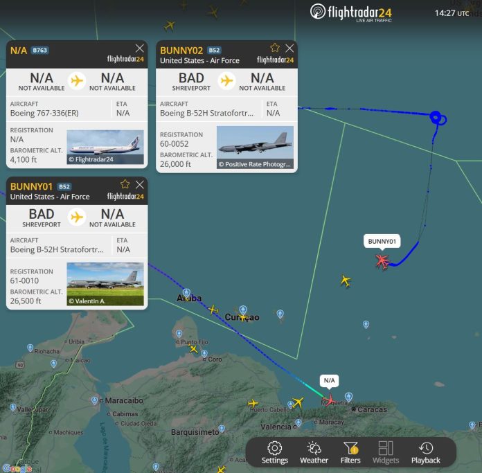 Dos bombarderos estadounidenses B-52 fueron detectados este miércoles sobrevolando muy cerca de las costas venezolanas, según registros de la plataforma Flight Radar. Identificados como Bunny01 y Bunny02, los aviones realizaron maniobras en círculos frente al litoral venezolano, en paralelo al despliegue de buques de guerra en el Caribe como parte de operaciones antinarcóticos de Estados Unidos.