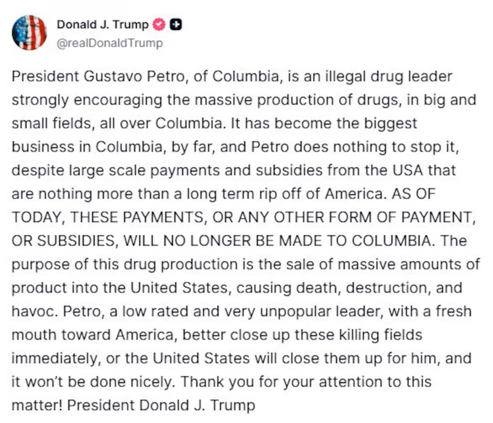 El presidente estadounidense aseguró que, desde este momento, se cancelan todos los pagos y ayudas hacia Colombia. “El propósito de esta producción de drogas es la venta de cantidades masivas de producto en Estados Unidos, causando muerte, destrucción y caos”, afirmó.