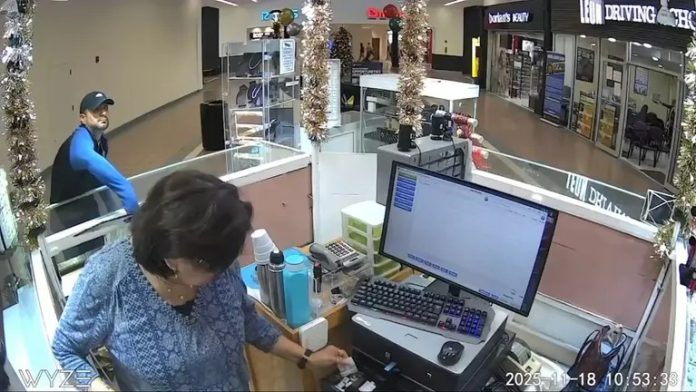Un video de seguridad muestra al sospechoso, vestido con una camisa negra de mangas azules, abriendo una bolsa verde mientras la vendedora atendía a otra persona. Segundos después, aprovechó que la empleada le dio la espalda para ejecutar el robo y salir caminando del centro comercial.