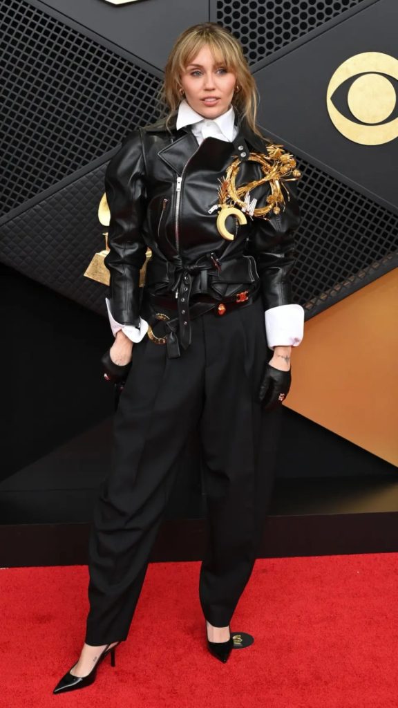 - Miley Cyrus: Optó por una estética rock-chic de aire masculino firmada por Celine, compuesta por pantalones sastre y una cazadora de cuero con detalles dorados.