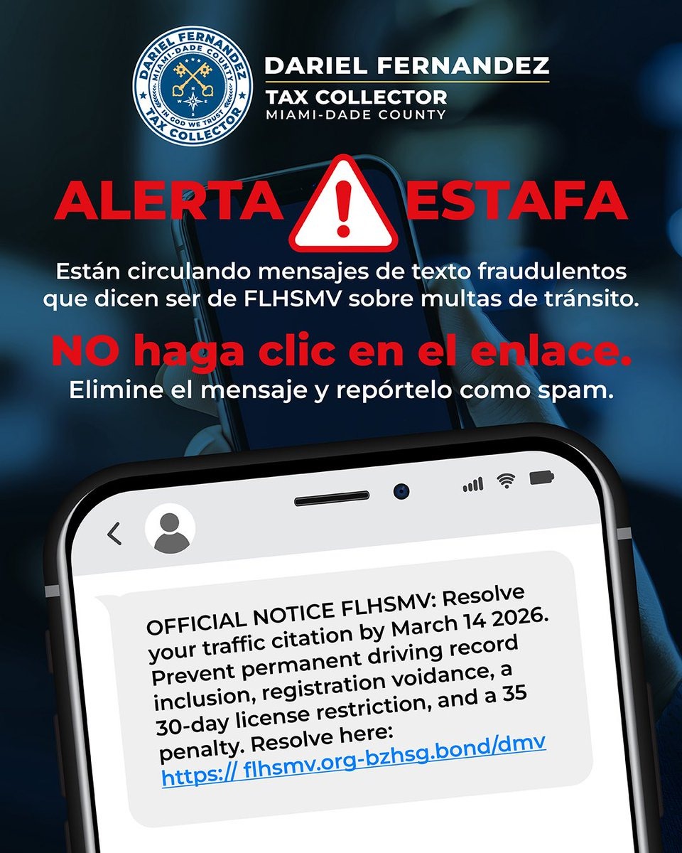 • No se solicitan pagos por SMS: Ni la Oficina del Recaudador ni el FLHSMV envían mensajes de texto pidiendo transferencias de dinero o pagos de multas.