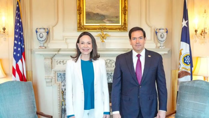 La líder opositora venezolana y Premio Nobel de la Paz, María Corina Machado, mantuvo este martes un encuentro privado con el secretario de Estado, Marco Rubio, en la sede del Departamento de Estado. La reunión, calificada por Machado como “excelente”, se produce en un momento de reconfiguración total de la estrategia estadounidense hacia Caracas, marcada por la reciente reapertura de la embajada de EE. UU. en la capital venezolana y el reconocimiento de Delcy Rodríguez como presidenta interina.