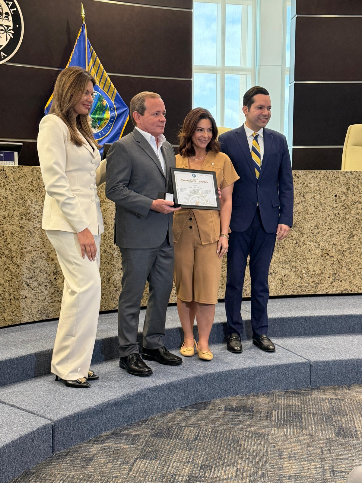 La distinción fue otorgada por la alcaldesa Christi Fraga, junto a los concejales Rafael Piñeiro y Nicole Reinoso, quienes hicieron entrega de la Moneda de la Ciudad de Doral, en reconocimiento a su lucha incansable por la libertad y la democracia en Venezuela.